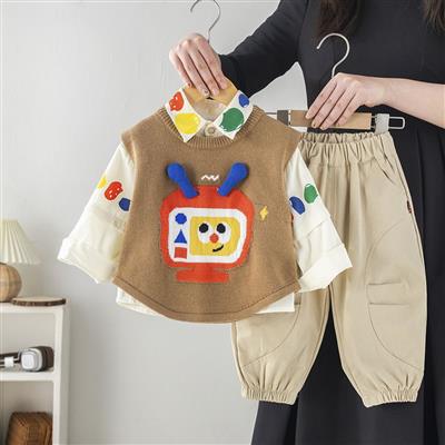 ست سه تیکه شومیز شیری و و جلیقه بافت قهوه ای و شلوار کتان کرم طرح تلویزیون انتن برجسته کد 20612