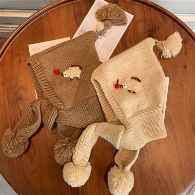 کلاه بافت با شال گردن یکسره پوم دار کد 21235