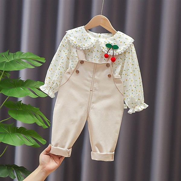 ست سه تیکه عروسکی شومیز گلدار و بافت خردلی و شلوار کتان گت دار کرم کد 18297