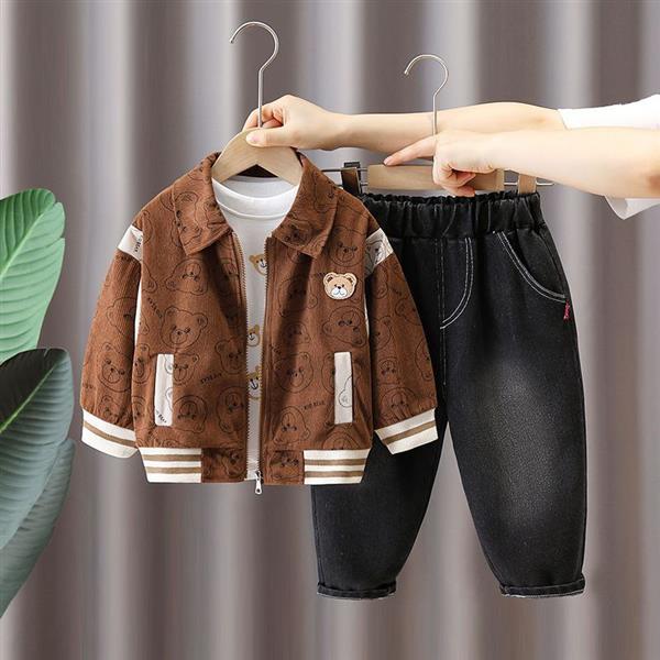 ست سه تیکه عروسکی شومیز نخی کرم و ژیله بافت قهوه ای گل برجسته و شلوار جین ابی کد 18300